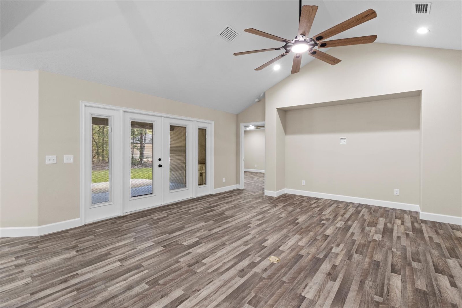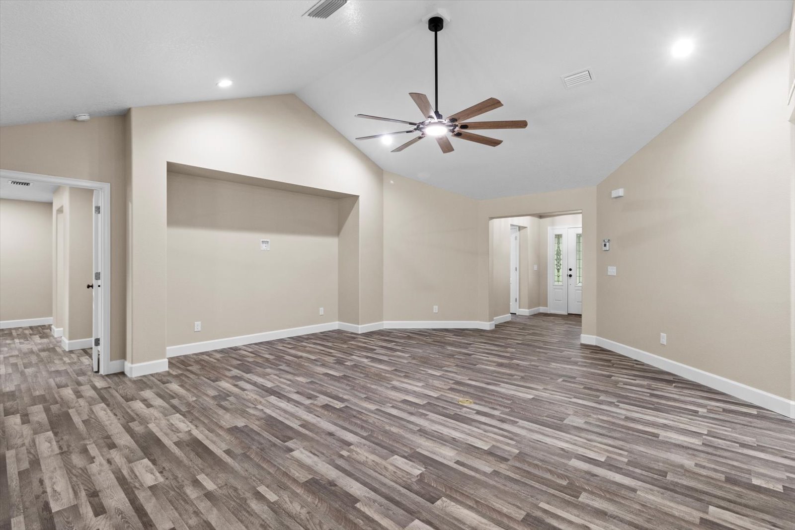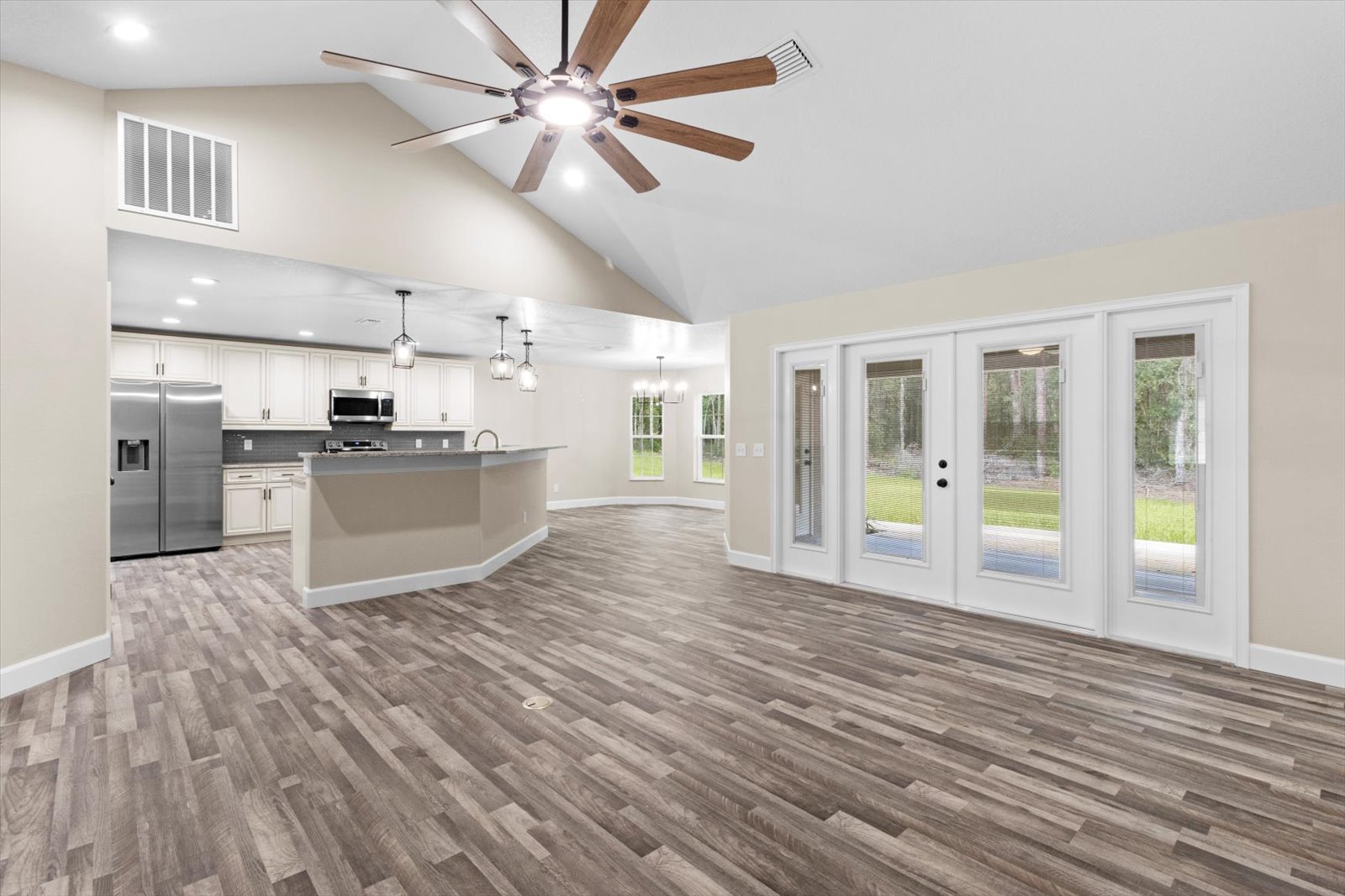 An expansive floor plan with an open living room and kitchen