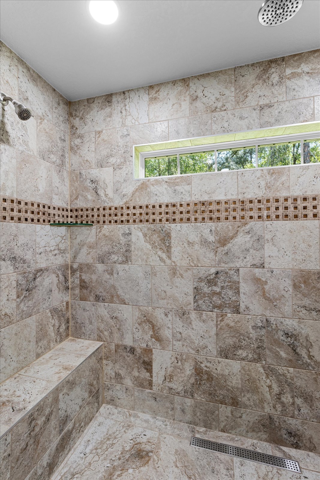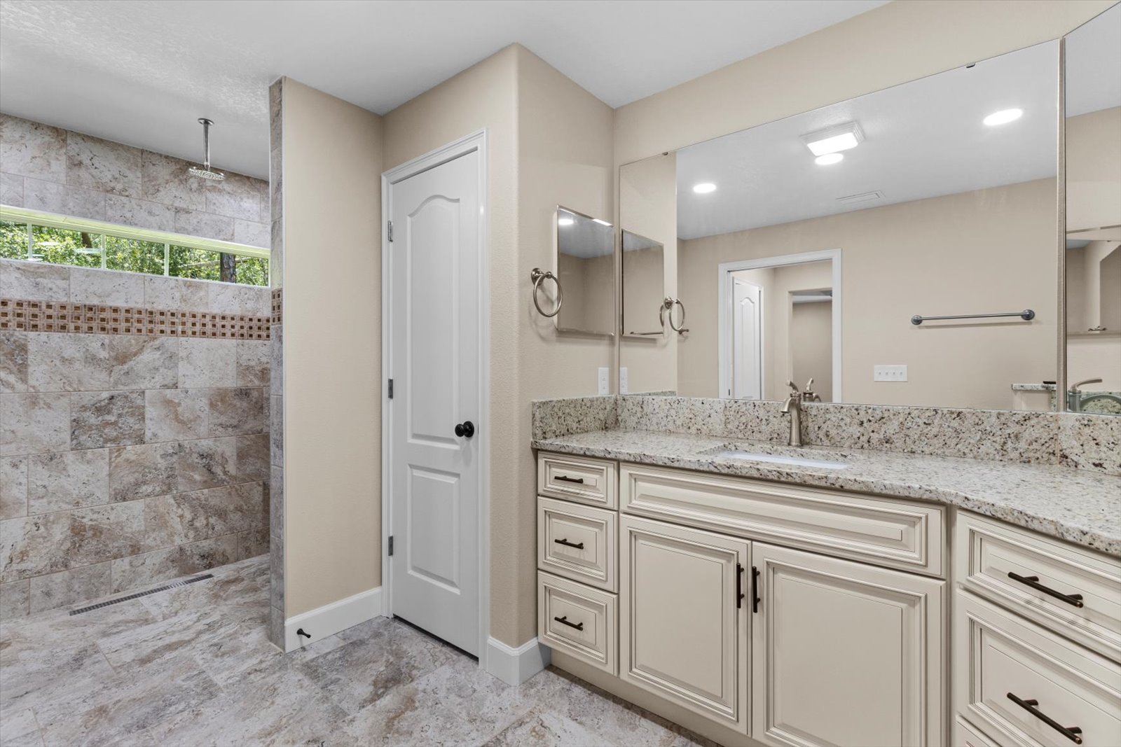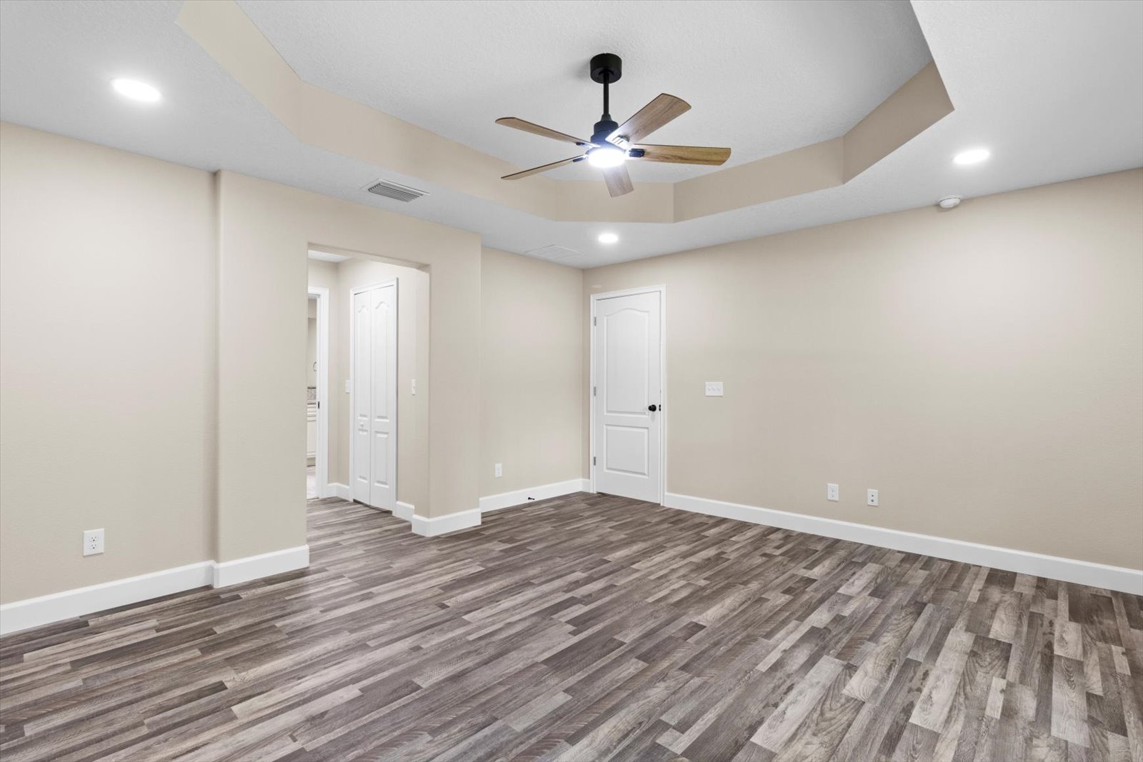 A large master suite with a tray ceiling, twin walk-in closets, and a dual-head curbless shower in the master bath