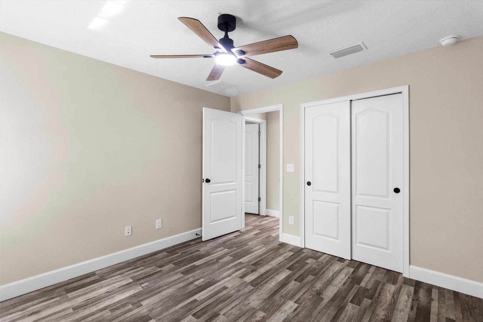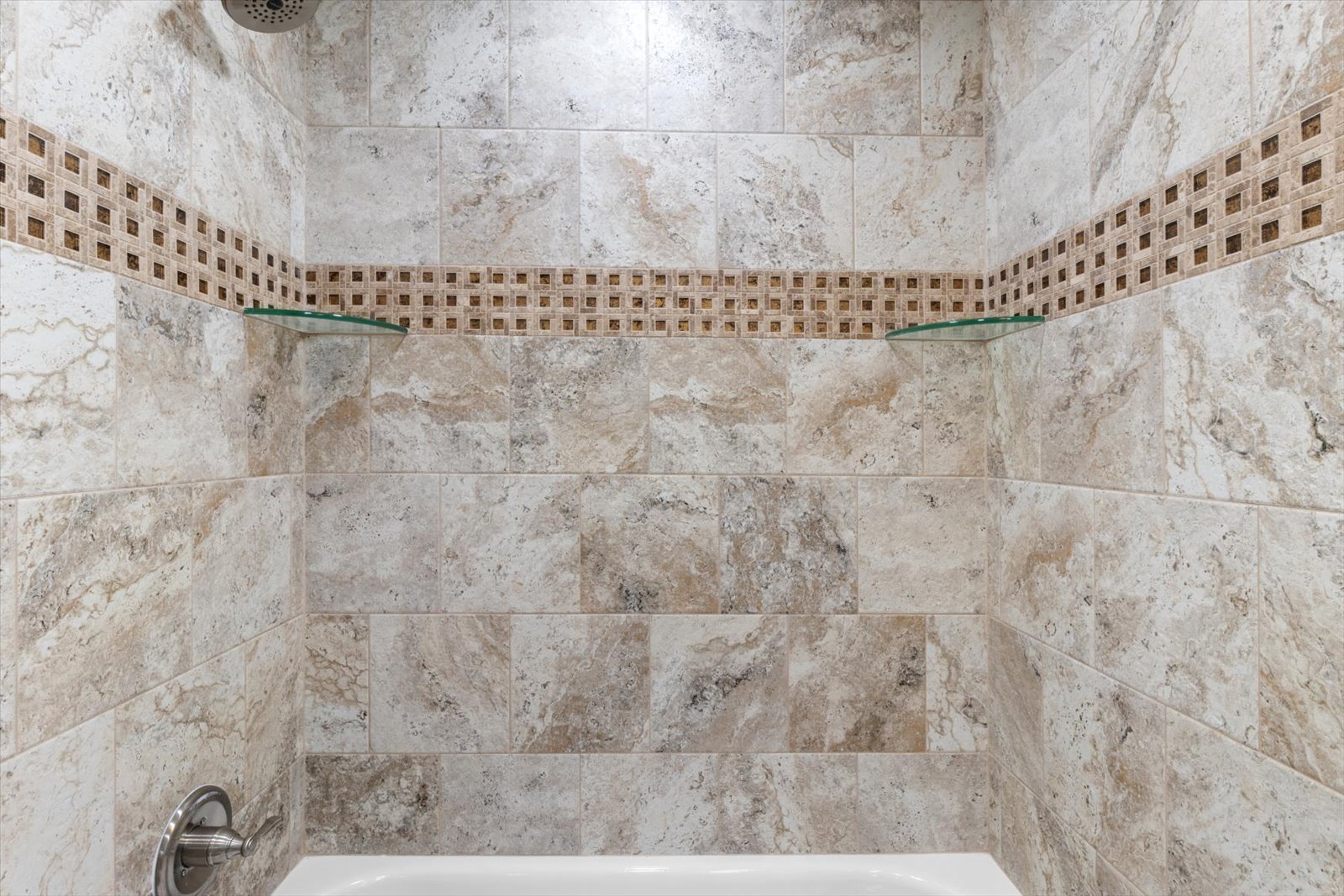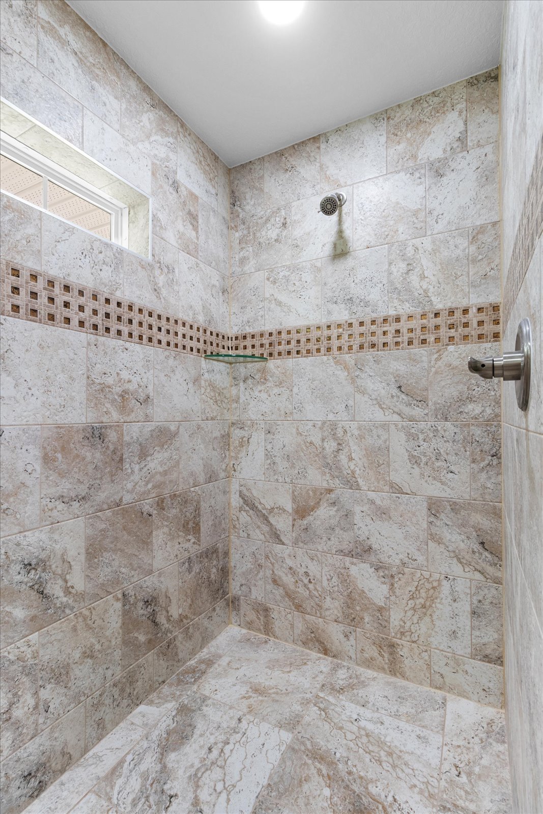 A large master suite with a tray ceiling, twin walk-in closets, and a dual-head curbless shower in the master bath