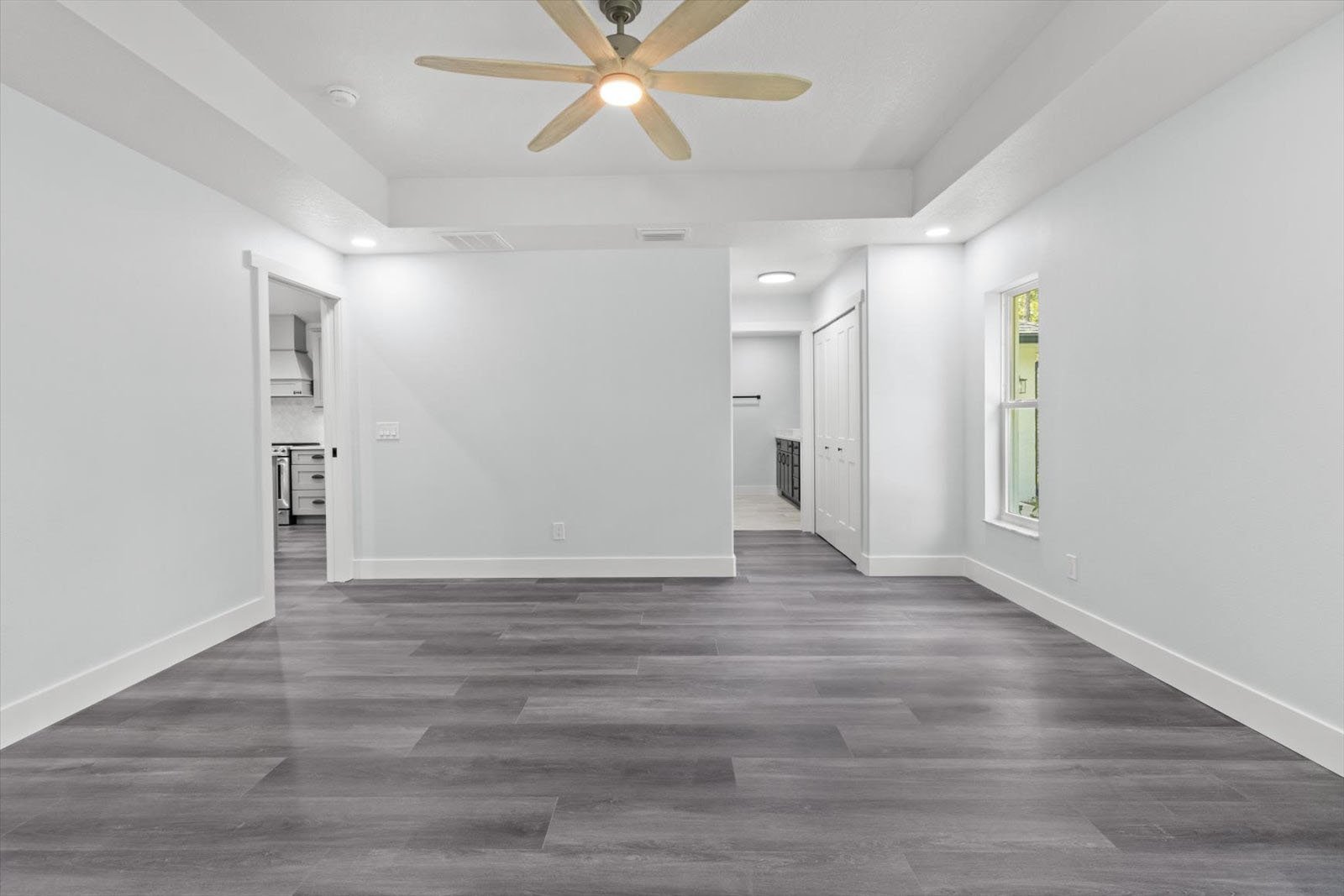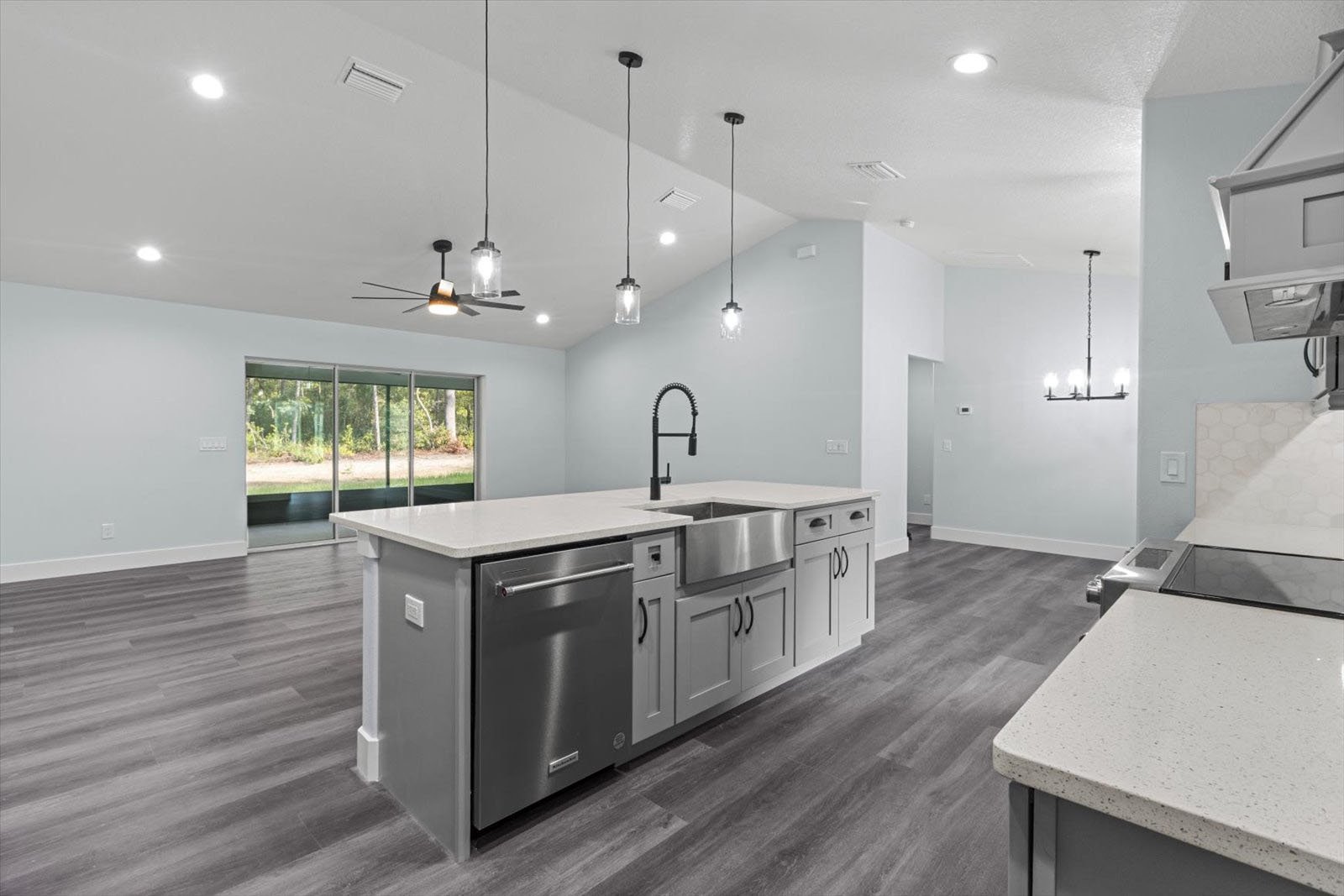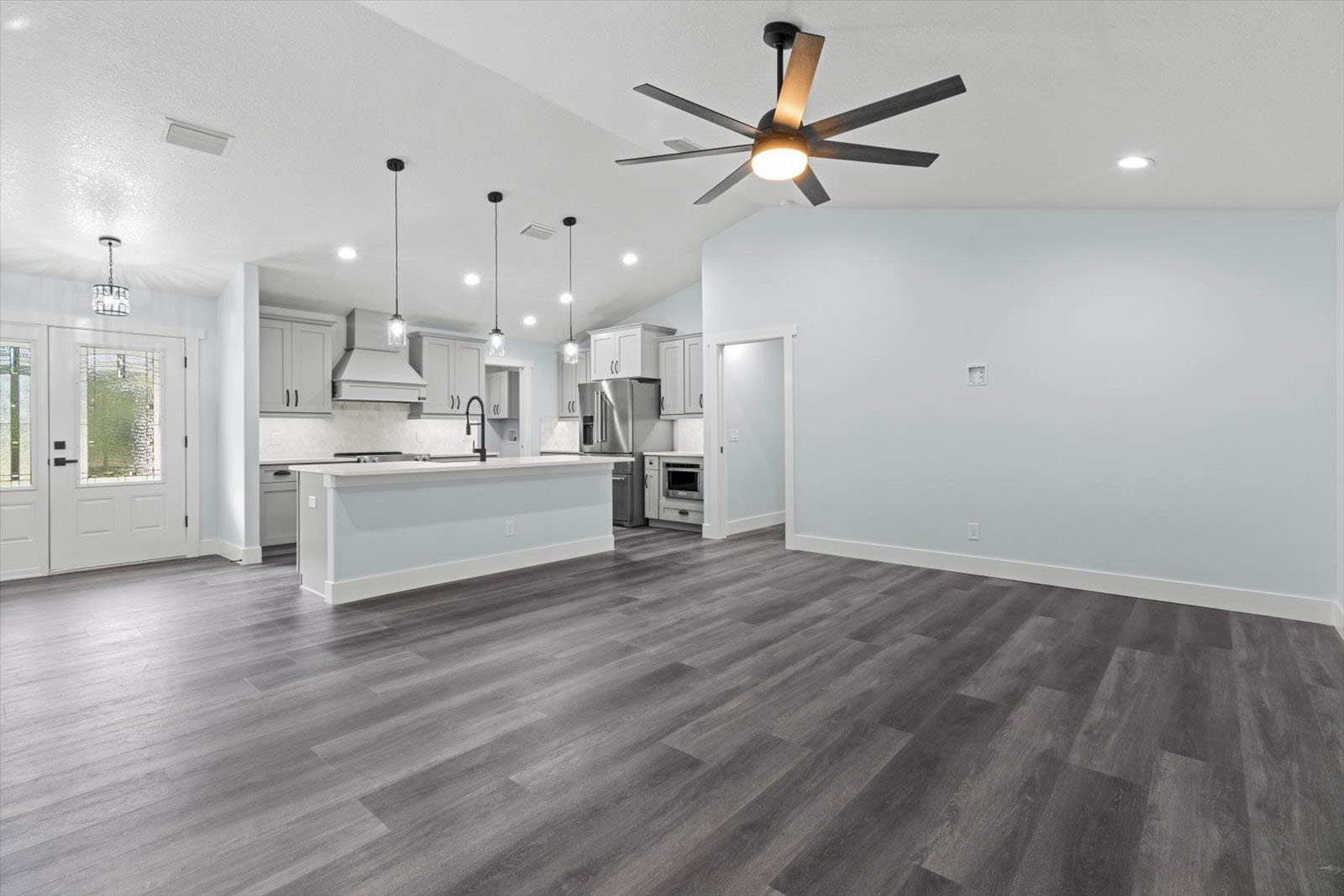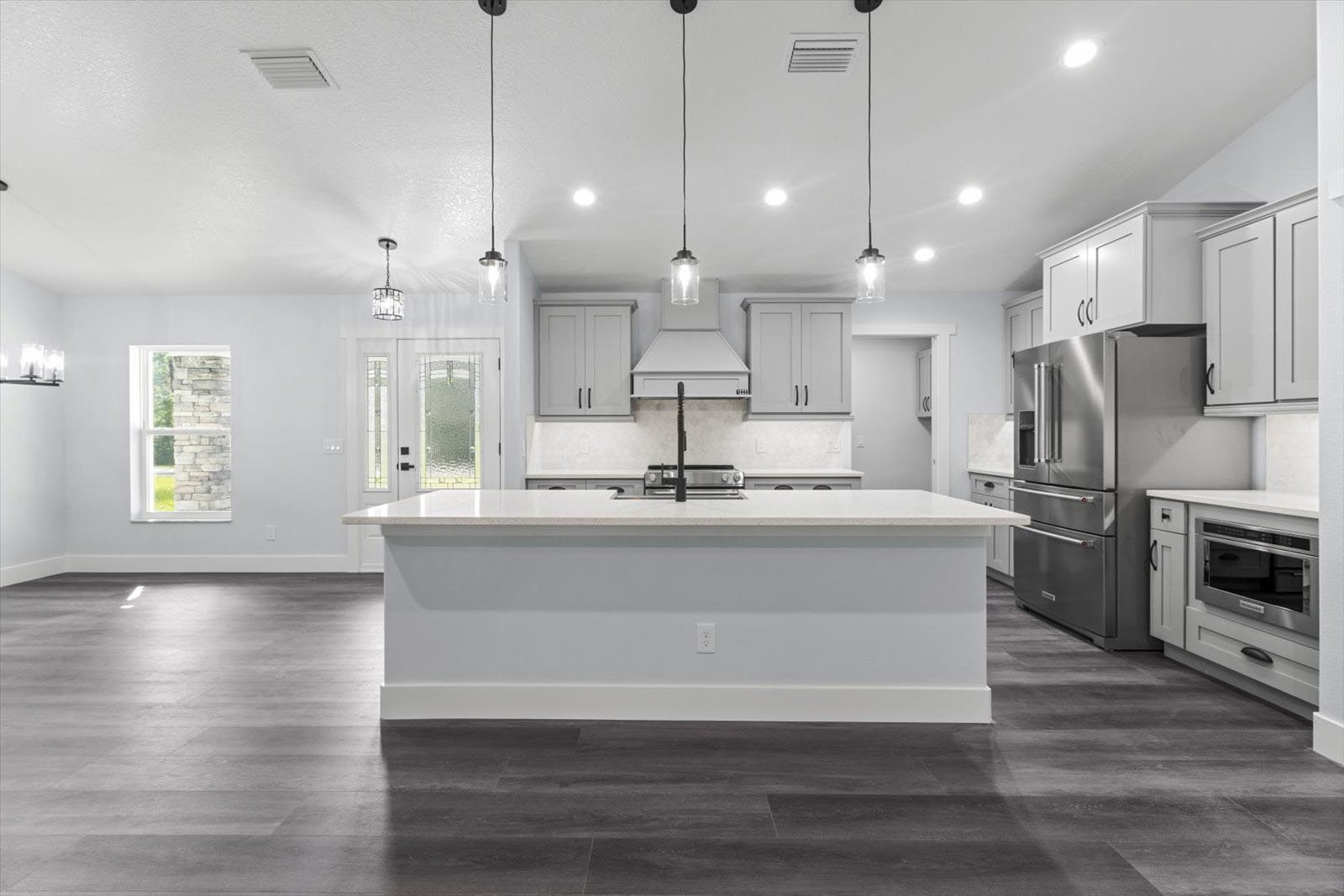 • An expansive floor plan with an open living room, dining room, and kitchen