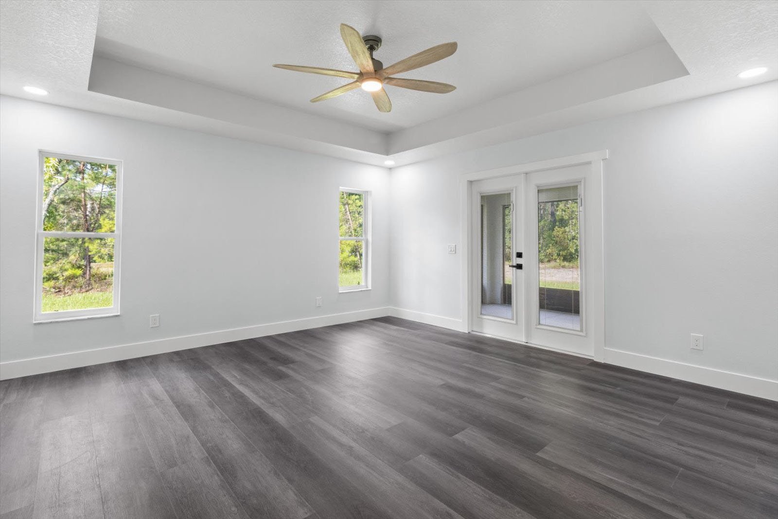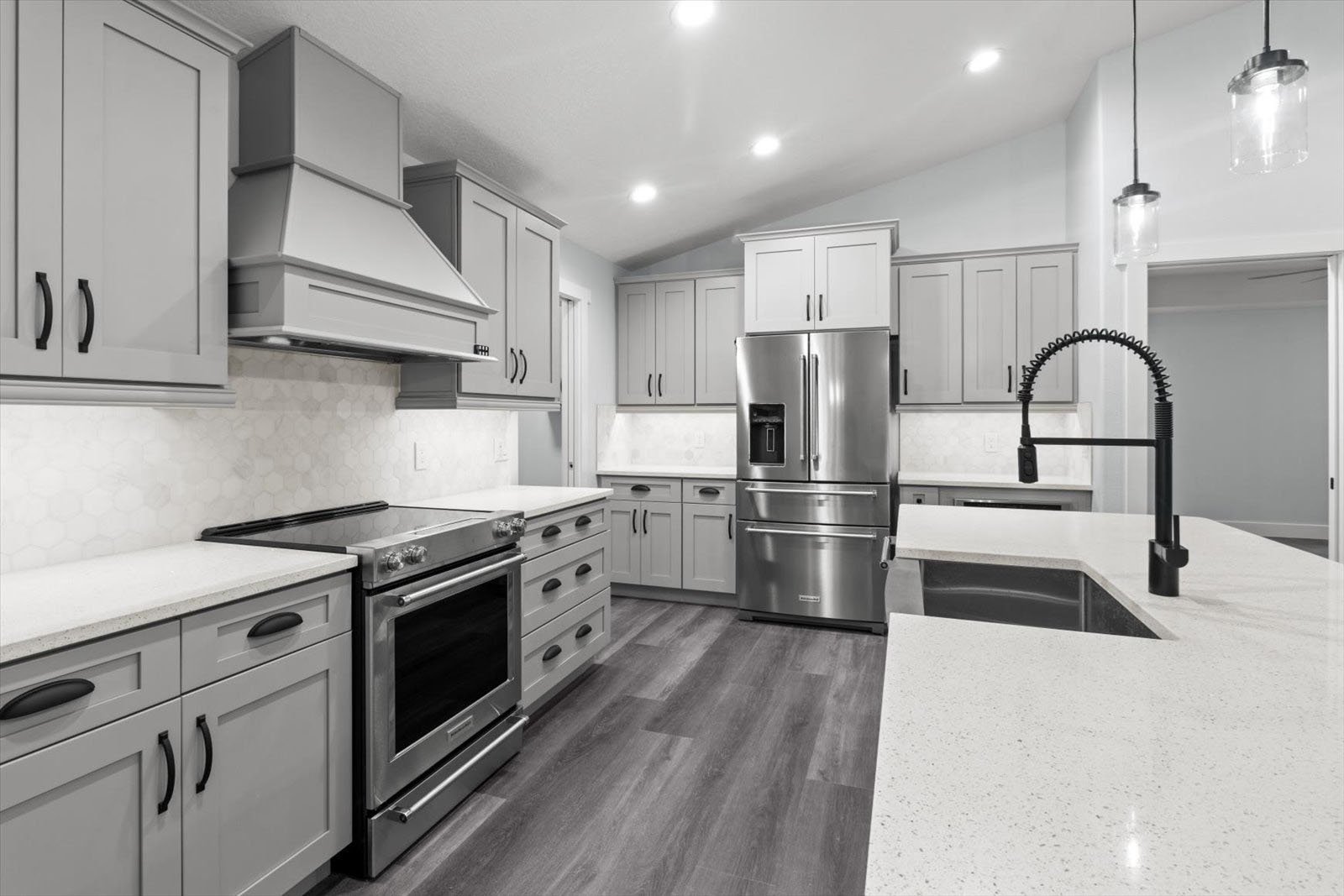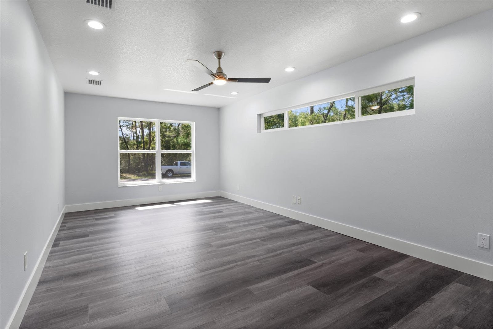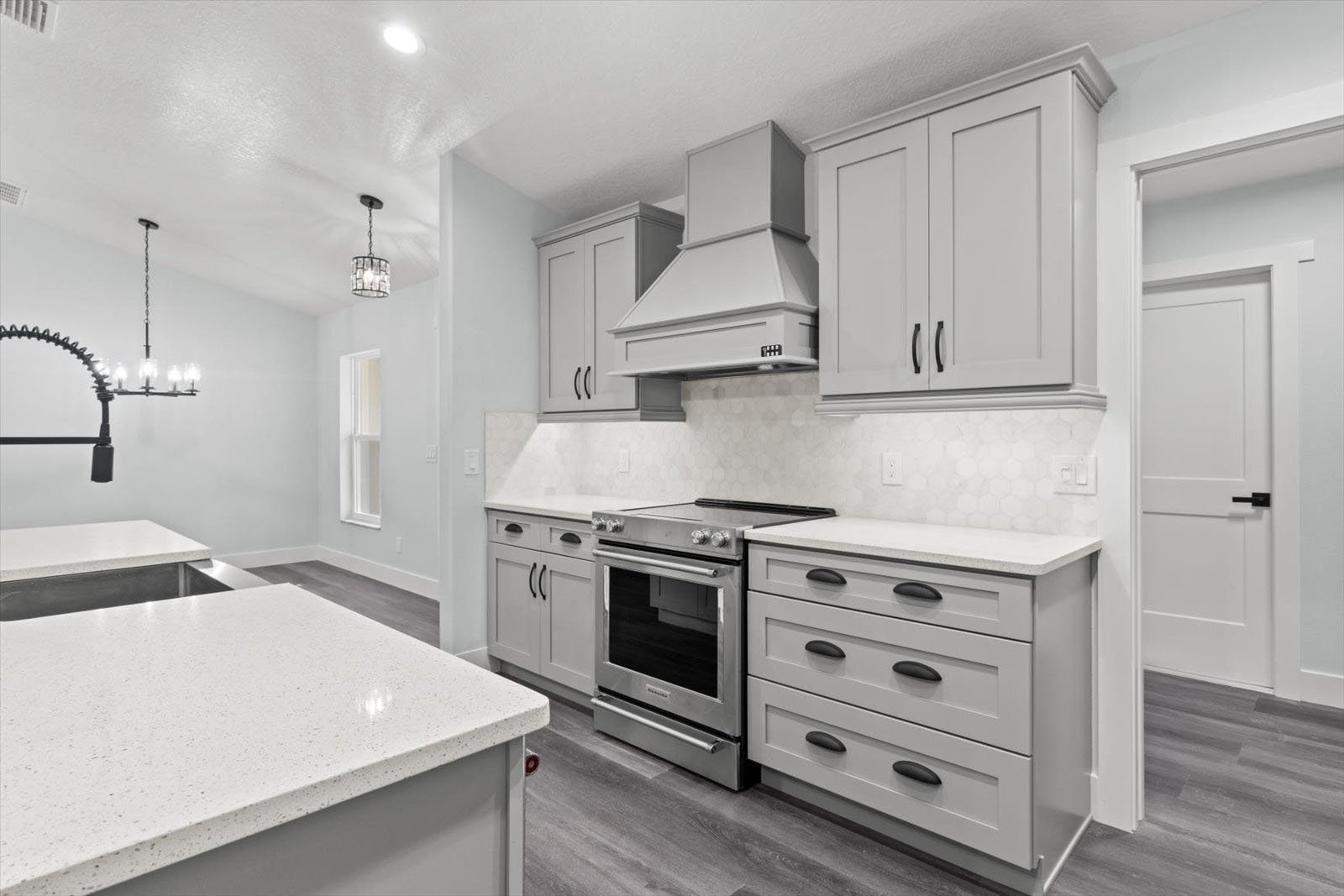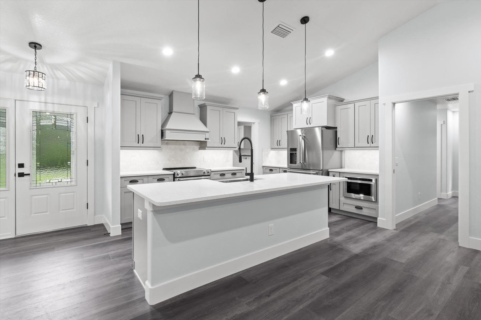 • An expansive floor plan with an open living room, dining room, and kitchen