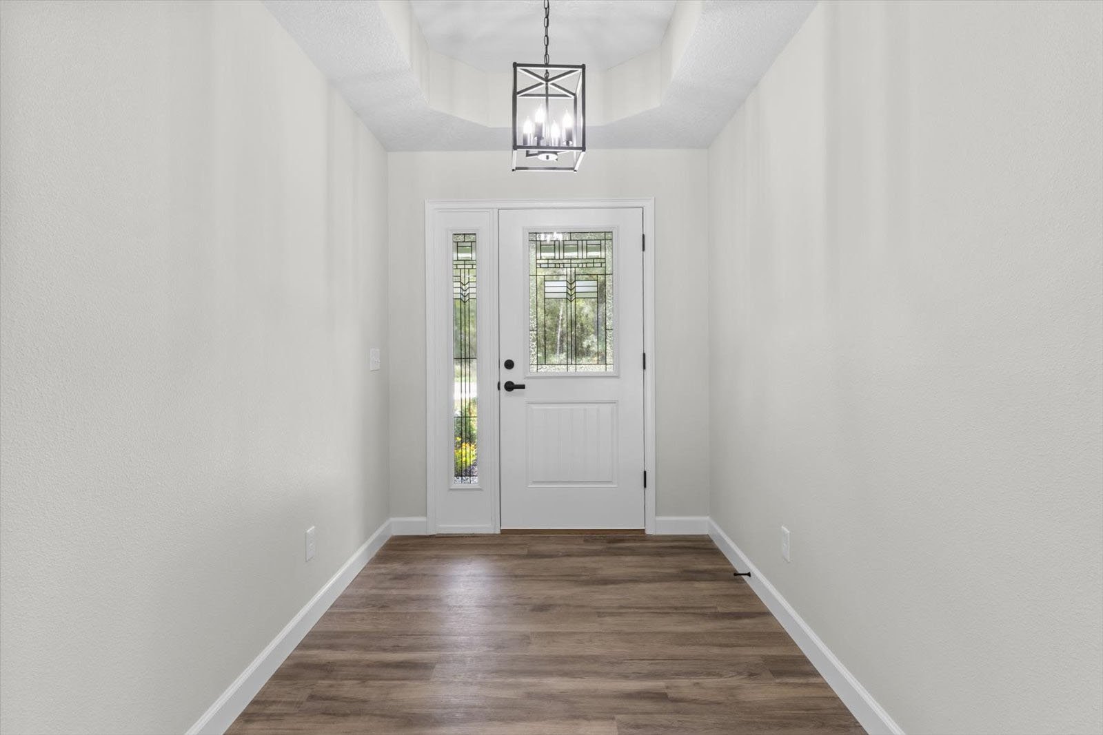 A welcoming covered entry at the front of the house followed by a lovely foyer with tray ceiling just inside