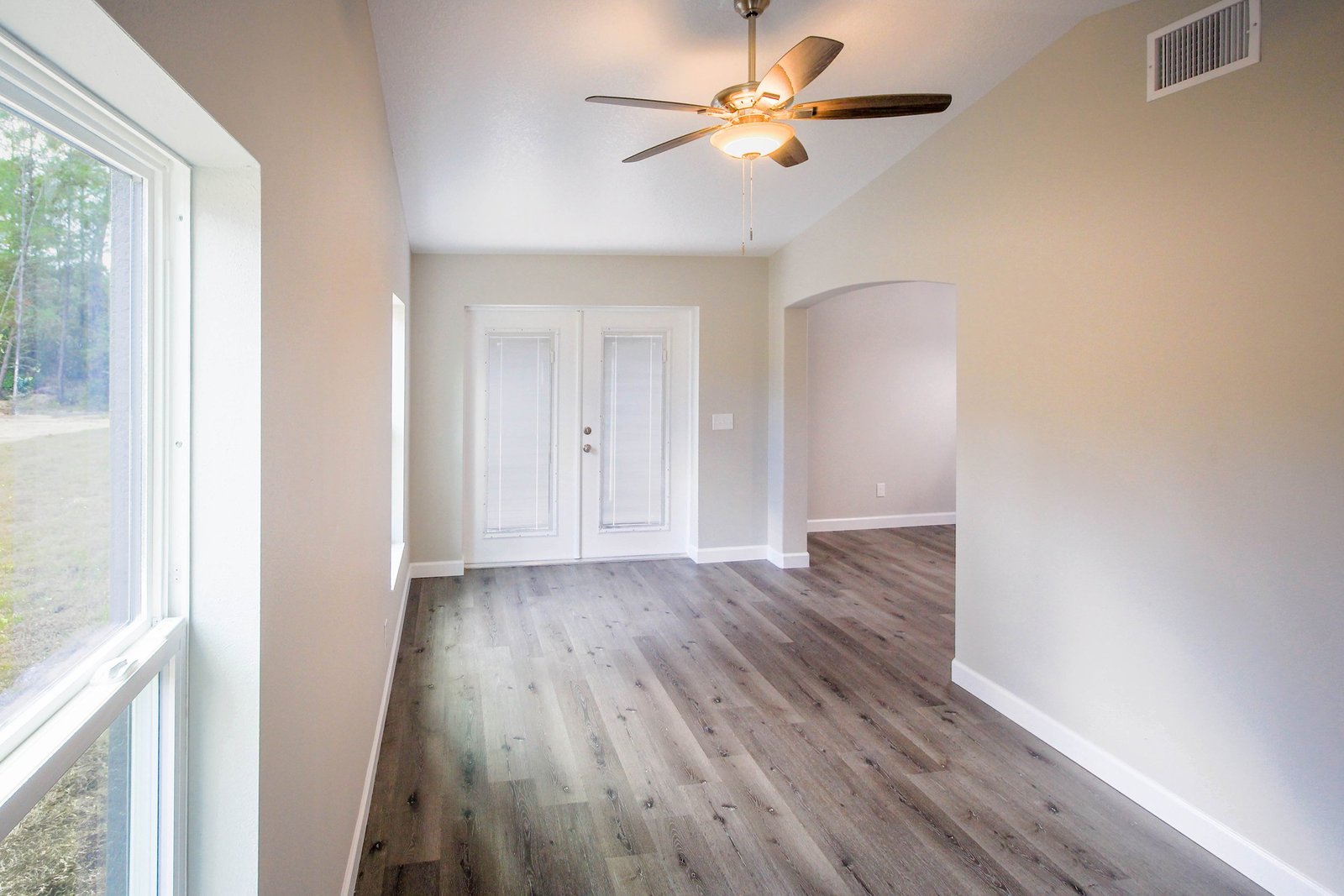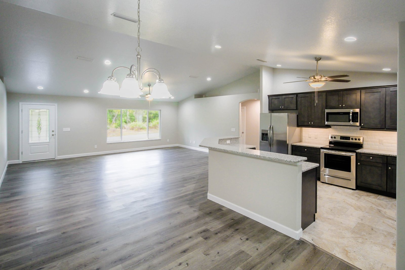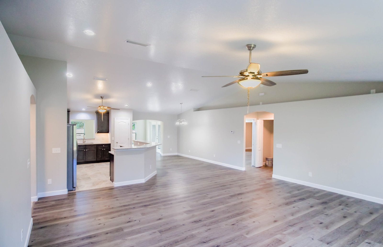 • A vaulted ceiling in the formal living room, dining room, and kitchen creating an open and expansive floor plan